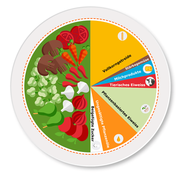 Einfach gesagt sollte das Essen vom Volumen her etwa zur «Hälfte aus Gemüse und Obst bestehen; die andere Hälfte sollte, gemessen am Kaloriengehalt, hauptsächlich aus Vollkornprodukten, pflanzlichen Eiweißquellen, ungesättigten pflanzlichen Ölen und (optional) bescheidenen Mengen an tierischen Eiweißquellen bestehen.